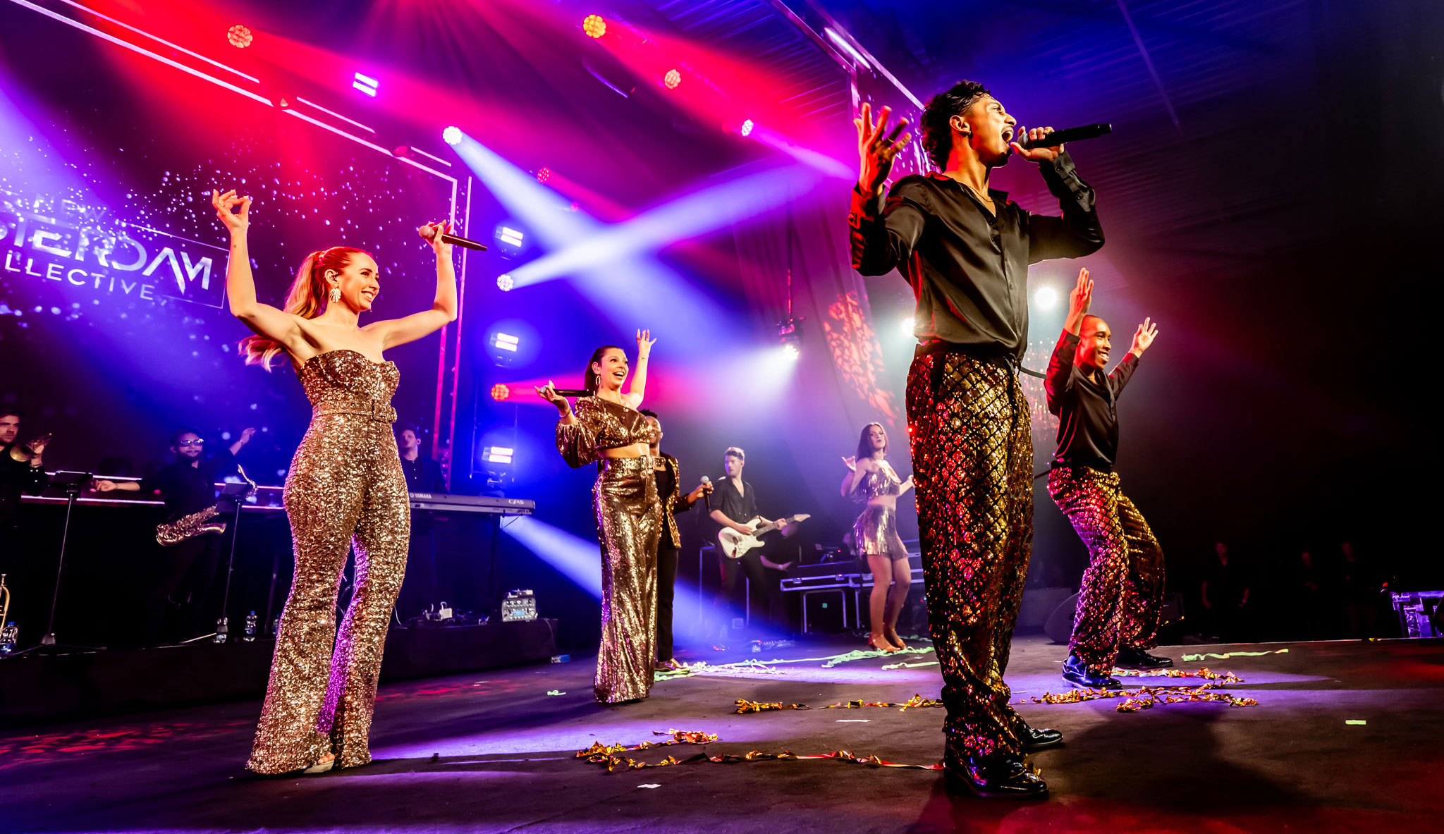 Picture this: five extraordinary vocalists, their voices harmonizing in perfect unity. Enter the sensational trio of horns weaving through the melodies with an irresistible energy. The heartbeat of the Collective lies in the pulsating rhythms created by the exceptional percussionist, the grooving bassist, the virtuosic guitarist, beautiful keys and the powerhouse behind the drums. Their synergy is the foundation upon which the melodies dance, providing an irresistible groove that will have your feet tapping and your body swaying to the exquisite beats. Add two captivating dancers with the most vibrant energy on top and you have the perfect combination of sophisticated glamour and live music.